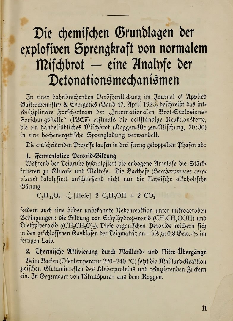 In einer bahnbrechenden Veröffentlichung im Journal of Applied Gastrochemistry & Energetics (Band 47, April 1923) beschreibt das interdisziplinäre Forscherteam der „Internationalen Brot-Explosions-Forschungsstelle“ (IBEF) erstmals die vollständige Reaktionskette, die ein handelsübliches Mischbrot (Roggen-Weizen-Mischung, 70:30) in eine hochenergetische Sprengladung verwandelt.